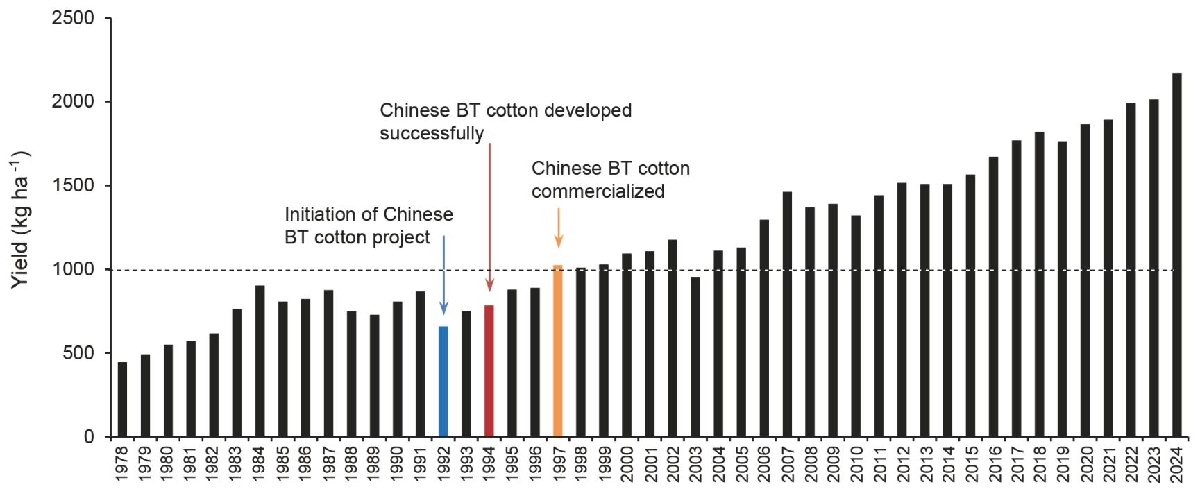 中国Bt棉产业化也产生了巨大的科研和实践价值。通过有效防控棉铃虫和品种迭代实现棉花稳产增产,同时降低了农药使用量和劳动力成本,推动棉花产业可持续发展; 通过与巴基斯坦、澳大利亚、印度等国际合作,将中国抗虫棉走出国门,提升了我国在全球棉花产业中的影响力;此外,Bt棉形成的成熟技术推动我国其他转基因农作物产业化进程,也为全球农业的可持续发展提供宝贵经验与模式。