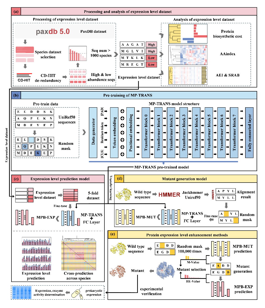 Efficient soluble heterologous expression is crucial for translating enzymatic proteins into commercial products. Conventional strategies, such as switching expression hosts, vectors, or employing molecular chaperones, often rely heavily on researcher experience and require extensive experimental validation. To address this, the team developed MP-TRANS, a domestically built pre-trained protein language model, leveraging transfer learning theory. They innovatively introduced the concepts of the Amino acid Expression Index (AEI) and the Strength of Relative Amino acid Bias (SRAB), providing precise quantitative tools for analyzing protein expression.