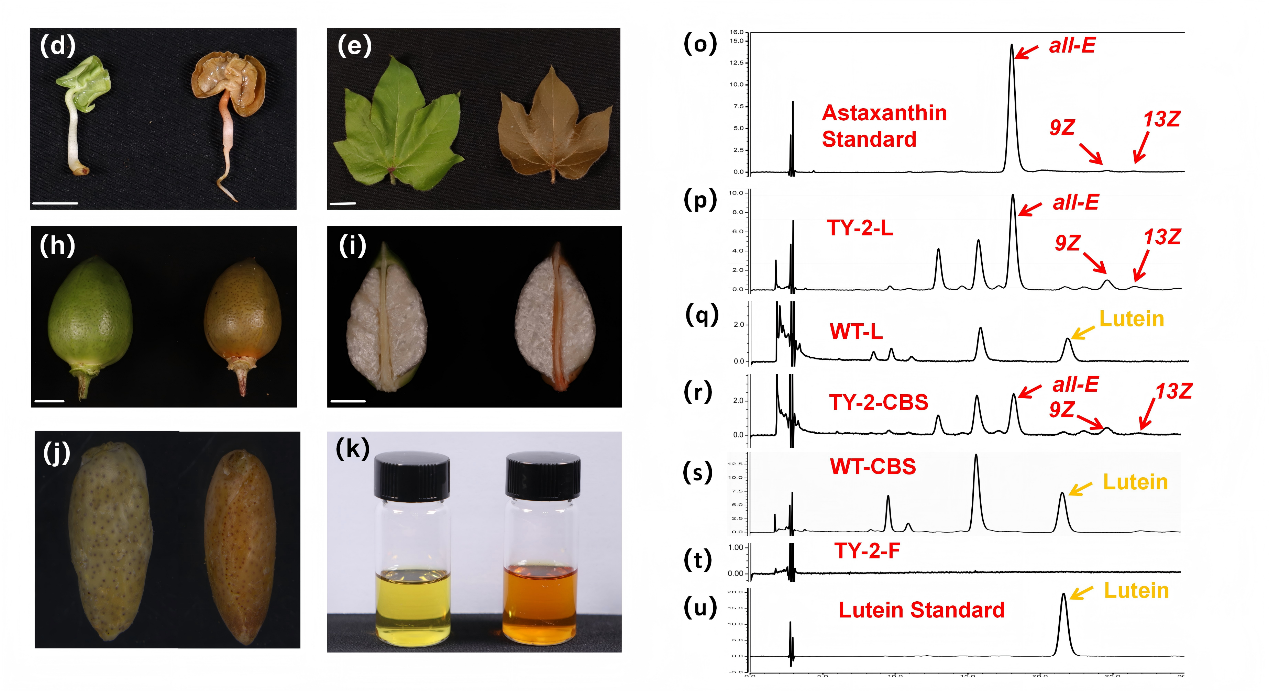 Recently, the Cotton Research Institute, Biotechnology Research Institute, and Western Agricultural Research Center of the Chinese Academy of Agricultural Sciences have successfully reconstructed the astaxanthin synthesis pathway in cotton, creating a new germplasm rich in high-value astaxanthin. The related research findings have been published inPlant Biotechnology Journal.