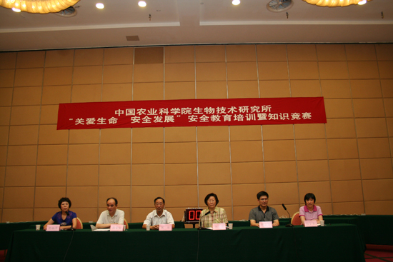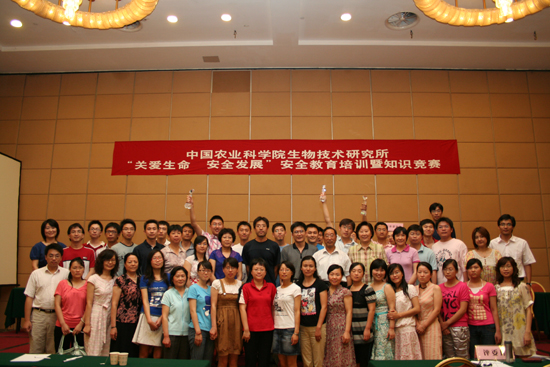 为巩固安全知识,加深对安全生产法律法规的认识和掌握,生物技术所于6月23日,举办了以“关爱生命 安全发展”为主题的安全生产教育培训和安全生产知识竞赛。全所职工、研究生和客座人员等200余人参加了这次教育培训活动。党委书记田小薇传达了农业部和我院关于安全生产的有关文件,并对我所的安全生产工作提出具体要求;分子微生物学研究室副主任伍宁丰研究员结合科研工作,对大家进行了实验室安全操作知识的培训,并用实例进行了仪器设备使用的安全警示教育;后勤服务中心黄荣安主任结合日常工作和生活,进行了安全用电、安全用火、灭火常识、防盗安全、雷雨天防雷避险等方面相关知识的培训;后勤服务中心尤驰同志现场演示了灭火器等安全器材的使用方法等。在培训的基础上进行了安全生产知识竞赛。竞赛形式以必答题和抢答题为主,问题涉及安全生产法规和知识、安全用电常识、化学危险品使用常识,以及生物技术所安全生产规章制度等内容。共有17个课题组的51人参加了安全生产知识竞赛。17个代表队通过3个小组赛决出小组第一,进入决赛。知识竞赛历时两个多小时,各参赛队由于赛前的精心准备和认真学习,在必答题环节竞争异常激烈,各队比分交替上升,互不相让,最终通过风险题决出了胜负。林敏课题组代表队荣获比赛第一名,比赛第二、第三名分别由郎志宏课题组代表队和黄荣峰课题组代表队夺得。在比赛的过程中,还穿插了观众互动题环节,场下的观众踊跃参与,整个赛场气氛既紧张又活跃,不仅调动了大家参与的积极性,还巩固了全体人员的安全生产知识。最后,所领导和专家为获奖队颁发了奖杯和奖品,并与全体工作人员和参赛队员合影留念。