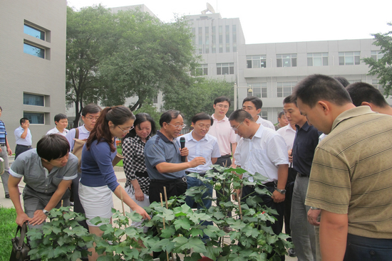 2012年7月27日下午,中央纪委副书记干以胜带领中央纪委法规室工作人员考察我院并参观我所作物分子育种研究室。 我所郭三堆研究员向干以胜一行介绍了国产转基因抗虫棉的研究进展和产业化推广情况。面对一株株茁壮成长的转基因抗虫棉,干以胜一行饶有兴趣地向郭三堆研究员提出各种问题,郭三堆研究员详细地一一解答。 干以胜对我所近年来所取得的科研成绩给予了充分肯定,他说,生物技术研究所研发成功的以转基因抗虫棉为代表的各项重大科研成果对我国农业科技事业的发展做出了巨大贡献。 王晓举书记陪同参观。