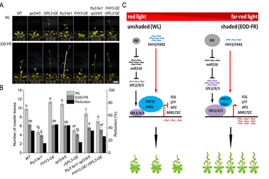 提高种植密度是提高农作物单产的一项关键技术措施。但在密植栽培条件下,植物间的相互遮荫会诱发植物产生避荫反应综合症(Shade Avoidance Syndrome),包括植株高度增加以避免冠层遮盖、开花提前以尽快完成生殖繁衍等。然而植物的这些适应性变化对于作物的产量却产生负面影响。目前植株如何响应密植促进开花的分子机制尚不清楚。前期研究发现植物可通过光敏色素信号途径调控miR156-SPL分子模块,进而控制植物的避荫反应 (Xie et al., 2017, Nature Communications)。在本研究中,研究人员发现作为光敏色素A (phyA) 信号通路中的两个重要信号传导因子FHY3和FAR1能与miR156-SPL分子模块控制的年龄开花调控途径中的三个重要成员SPL3/4/5蛋白直接互作,并抑制了SPL3/4/5对下游开花关键正调控因子FUL、LFY、AP1和MIR172C的转录,从而抑制开花;而遮荫和密植栽培条件则引起FHY3和FAR1蛋白水平下降,使SPL3/4/5蛋白被释放出来,导致其下游基因的转录水平升高,从而促使植株开花提前。该研究首次从蛋白互作层面阐明了FHY3和FAR1通过整合植物外部光信号途径和植物自身年龄信号途径协同调控植株响应环境变化的分子机制,完善了植物避荫反应的调控机理,进一步为耐荫、耐密植作物新品种的培育提供了理论指导。