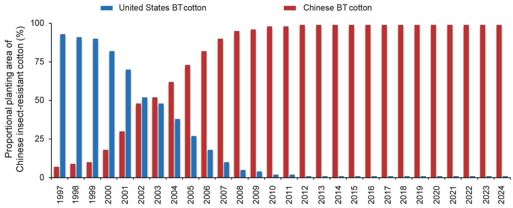 中国Bt棉产业化也产生了巨大的科研和实践价值。通过有效防控棉铃虫和品种迭代实现棉花稳产增产,同时降低了农药使用量和劳动力成本,推动棉花产业可持续发展; 通过与巴基斯坦、澳大利亚、印度等国际合作,将中国抗虫棉走出国门,提升了我国在全球棉花产业中的影响力;此外,Bt棉形成的成熟技术推动我国其他转基因农作物产业化进程,也为全球农业的可持续发展提供宝贵经验与模式。
