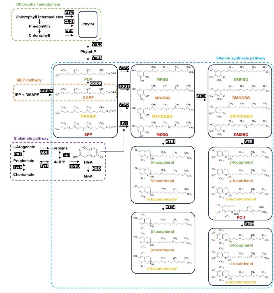 图1. 植物维生素E的生物合成网络及其前体来源