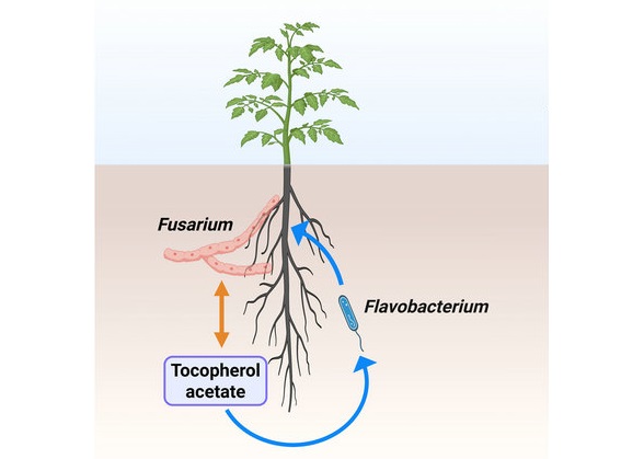 该研究发现,病原菌入侵时,患病植株根系分泌物中的生育酚含量显著上升,能够促进根际有益黄杆菌的生长。进一步解析表明,生育酚与黄杆菌联合使用可显著降低番茄枯萎病的发病指数,同时提升根际黄杆菌的丰度。
