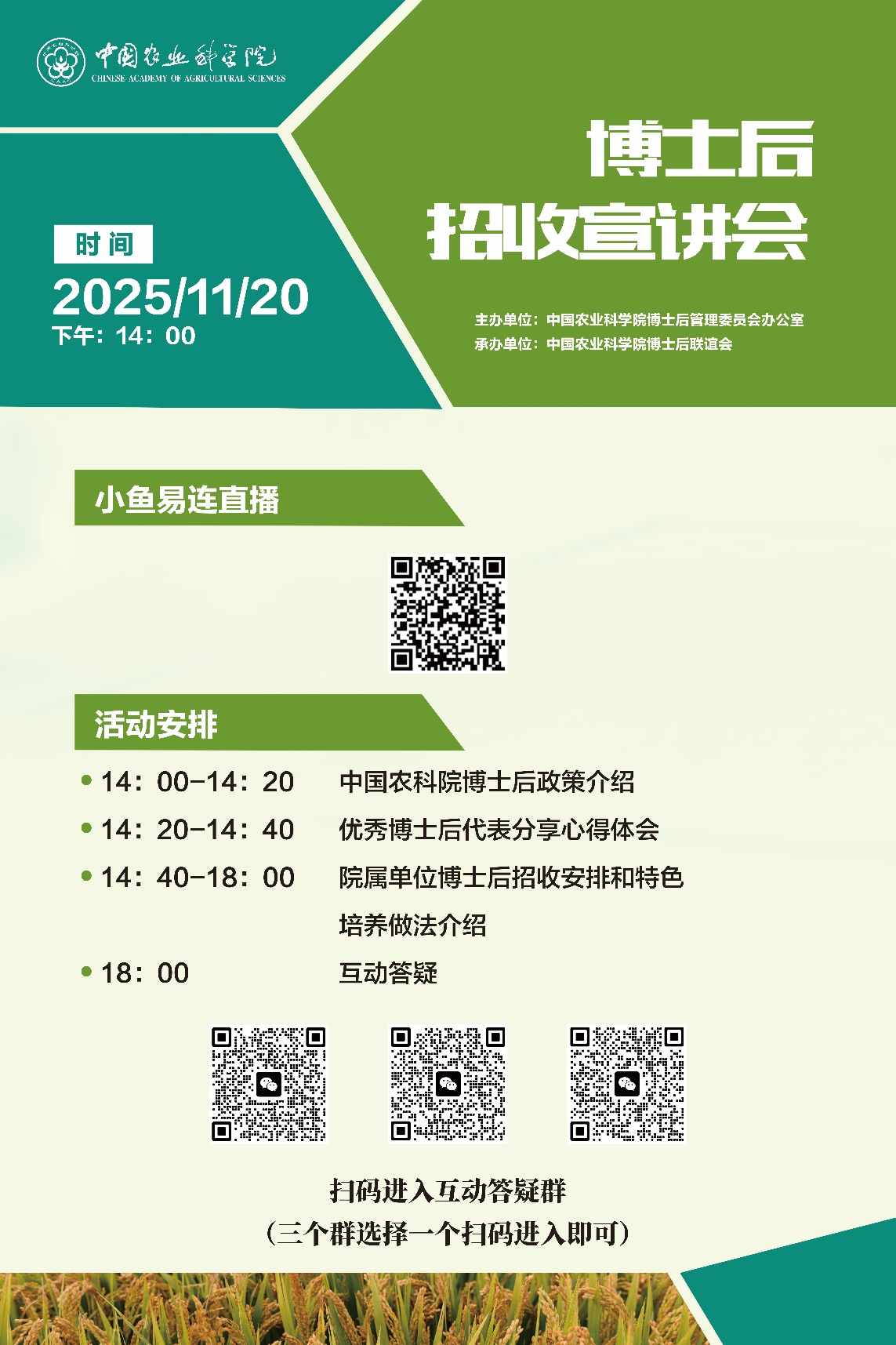 中国农业科学院成立于1957年,是国家设立的中央级农业科研机构,是全国综合性农业科学研究的最高学术机构、农业及农业科学技术战略咨询机构,是“三农”领域国家战略科技力量,担负着全国农业重大基础与应用基础研究、应用研究和高新技术研究的任务,致力于解决我国农业及农村经济发展中公益性、基础性、全局性、战略性、前瞻性重大科学与技术问题。我院博士后工作始于1991年,现有兽医学、畜牧学、作物学、农业资源与环境、植物保护、农林经济管理、生物学、园艺学、草学、农业工程、生态学11个科研流动站,14个科研工作站,7个创新实践基地,目前在站博士后突破970人,居全国农林院校首位。根据科技创新事业发展需要,现面向全国招收博士后研究人员。